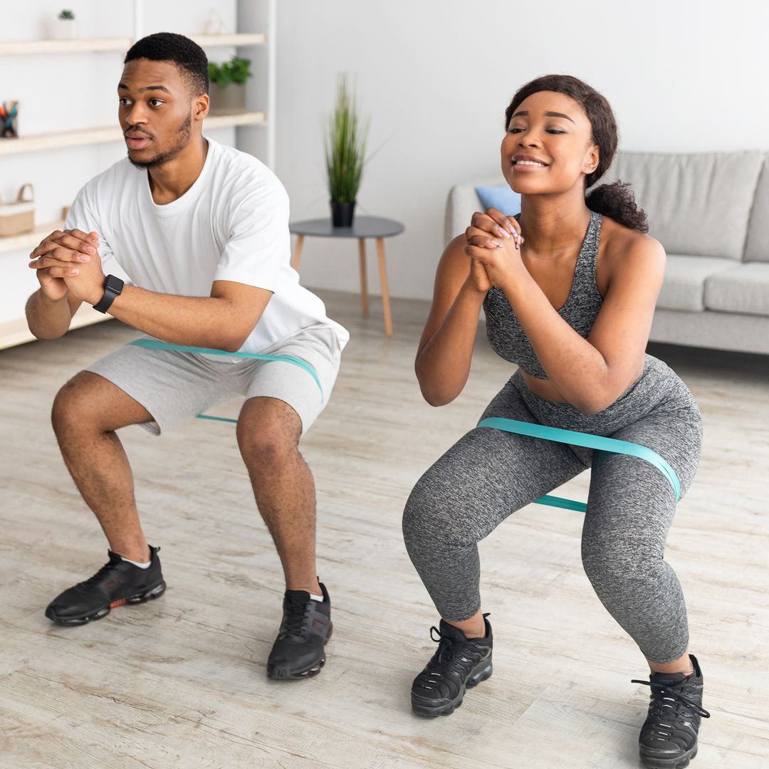 You'll need a resistance band for this one. Place the elastic band around your upper thighs while you do a classic squat - it adds extra resistance and helps to activate your glutes and abductor muscles.